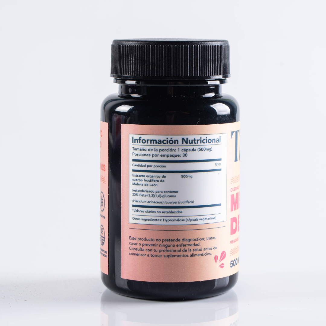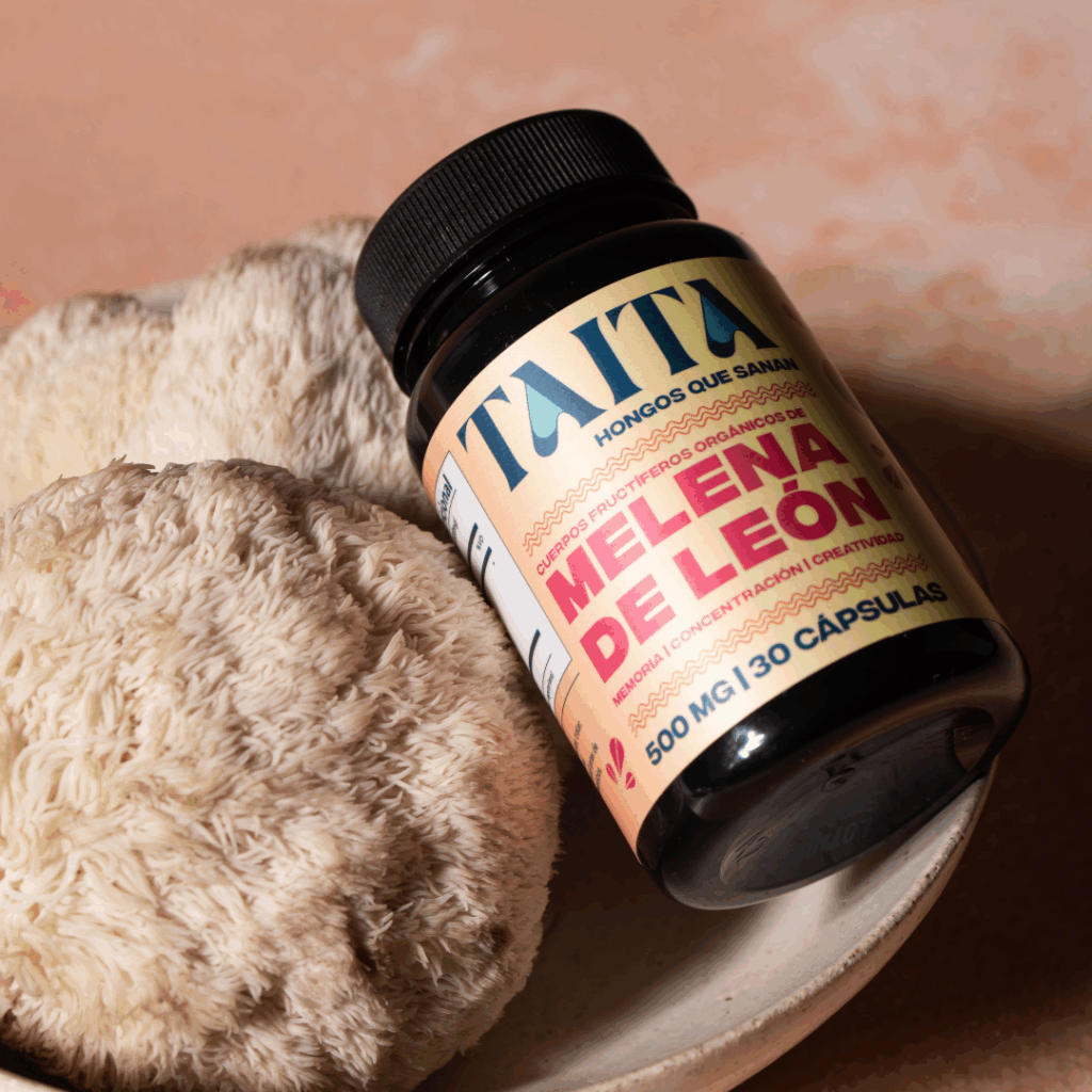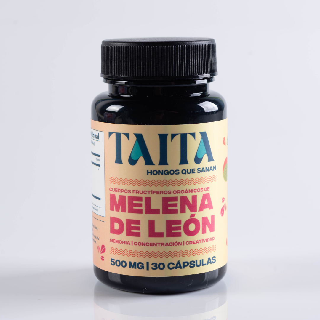 Cada frasco de TAITA contiene 30 cápsulas de 500 mg de cuerpo fructífero de Melena de León orgánico y sin rellenos.